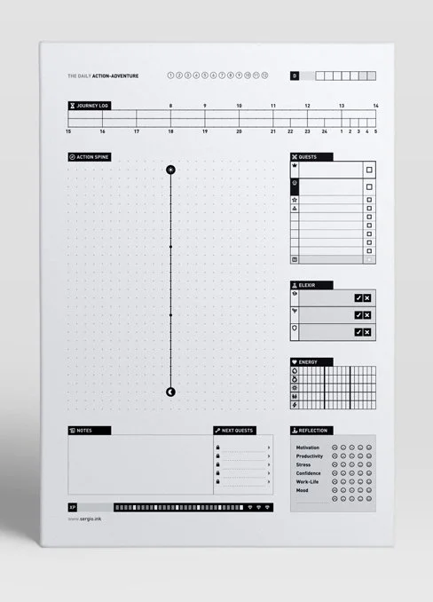 A printable template to structure and reflect on your day, track daily tasks and time, and build habits. Boost your daily productivity through analog, distraction-free focus.